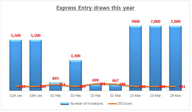 Following the trend of last few EE draws, on 29th March also, the IRCC invited 7,000 candidates, as the CRS (Comprehensive Ranking System) score requirement dropped to 481 points only. The CUT OFF is lowest this year until date.