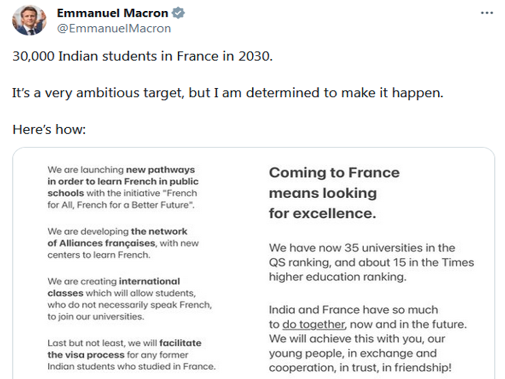 Last Friday, President Emmanuel Macron announced a significant initiative, expressing France's aim to host 30,000 Indian students in its universities by 2030. This ambitious venture is a pivotal step towards enhancing academic collaborations and fostering stronger ties between the two nations.