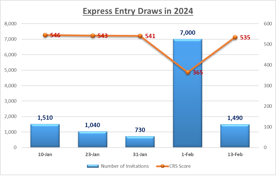 The Immigration Refugees and Citizenship Canada (IRCC) conducted fifth Express Entry draw of the year 2024 on 13th February. In this particular EE draw, the IRCC invited 1,490 Express Entry candidates under all categories, i.e.